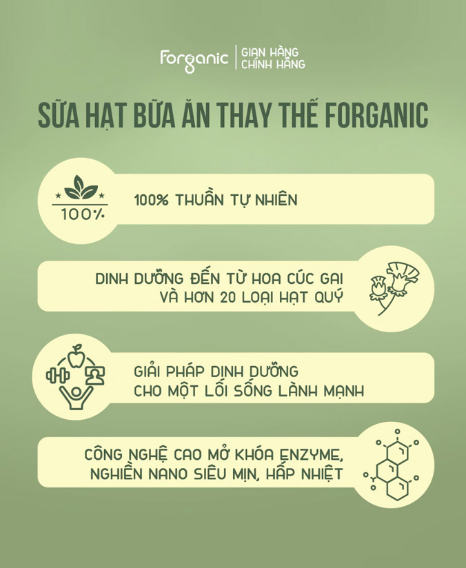 Sữa hạt bữa ăn thay thế Forganic là dòng sản phẩm dinh dưỡng tiện lợi, được thiết kế cho người bận rộn, người ăn kiêng, người luyện tập và phụ nữ sau sinh. Sản phẩm là sự kết hợp độc đáo giữa Silymarin từ hoa Cúc Gai – nổi tiếng với khả năng bảo vệ gan và hỗ trợ trao đổi chất, cùng hơn 20 loại hạt quý như Macca, óc chó, hạnh nhân, yến mạch, chia, đậu gà... Tỷ lệ protein thực vật trong sản phẩm lên tới 36%, cung cấp nguồn năng lượng dồi dào, giàu dưỡng chất nhưng không gây tăng cân hay nặng bụng. Sản phẩm có vị béo nhẹ, dễ uống, phù hợp cho cả người mới bắt đầu.