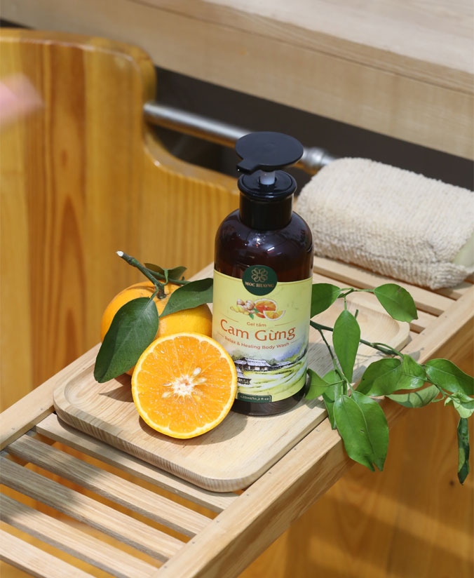 Kết hợp Vitamin C tự nhiên từ Cam và tinh dầu Gừng ré Bắc Kạn cô đặc gấp 100 lần so với gừng tươi bằng công nghệ CO₂ siêu tới hạn, Gel tắm thảo dược cao cấp Cam - Gừng Mộc Hương giúp chống oxy hóa, làm dịu tác động của tia UV, làm sáng và đều màu da, đồng thời giữ ấm, giảm mệt mỏi và mang lại hương thơm tươi sáng, đầy năng lượng.